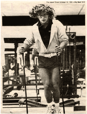 During this exercise, he shows how people typically take one huge breath and hold it during these movements. But that is incorrect. He emphasizes proper breathing and how to catch the maximum amount of oxygen at the best opportunity. Next he moves to a bench and from a standing position on the floor, jumps up softly onto it, into a standing position. This could be expanded to jumping up, pausing, and jumping softly down again to the front. Other machines in the gym use small repetitious movements to work the front tibial muscles along the shins ("This is where the first fatigue you have is," says Jean-Robert) the quads, the hamstrings in the back of the legs, the forearms, and the triceps. Stomach exercises, called "crunches", are emphasized to help prevent back injuries. Jean-Robert takes his clients through a slow warmup, an "explosive workout" and a slow cool-down, all lasting about an hour, sometimes longer. Light weights (two to three pounds) are sometimes strapped on the legs for a better workout, and later, ski boots may even be added to simulate the real thing. Jean-Robert has just begun offering a group class, of no more than five at a time, for the ski conditioning. Geared to working locals, the class is only $15/hr and held in the evenings. There are still openings. Aspenites take their skiing very seriously, indeed.